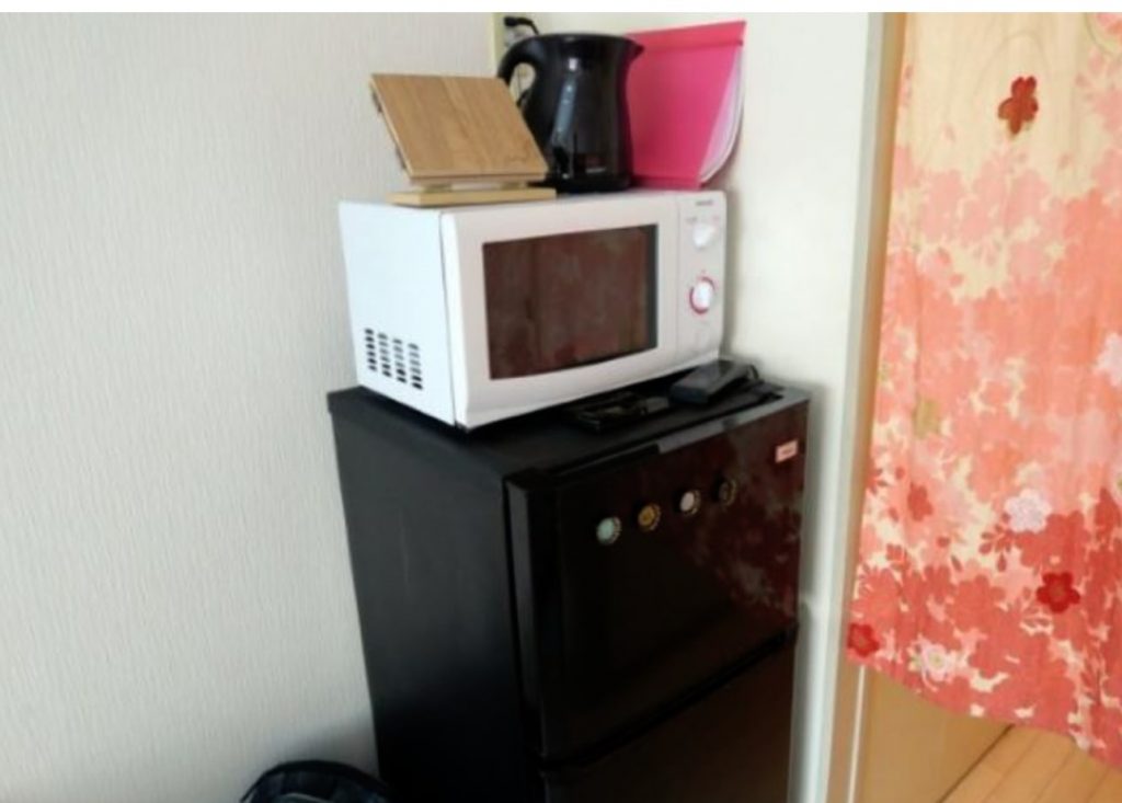 У кутку кімнати розташовані холодильник, мікрохвильова піч та електрочайник.